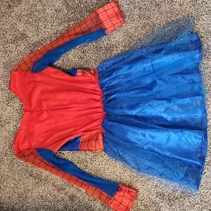 Dress up as a spider hero with this Marvel costume. Features a red and blue design with web patterns and sparkly tutu. Perfect for playtime and parties. Seams on both sleeves are torn, shown in photos. Perfect for play dress up. Size M 8-10, but runs small.