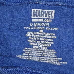 Marvel Spider-Man men’s sweatshirt, size Medium. Features a bold comic book cover-style graphic print on a vibrant blue base. Soft and cozy material with a relaxed fit, perfect for vintage streetwear fans, collectors, or anyone wanting to rep their favorite superhero.