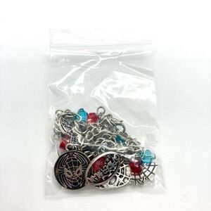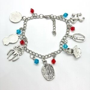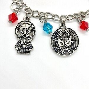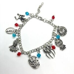 A charm bracelet featuring 7 charms and 8 red and blue beads. Charms are Spiderman crawling, logo, top part of suit, mask, spider emblem, Skottie Young style spider man, and spider signal. Lobster clasp closure. Silver tone zinc alloy.
