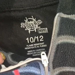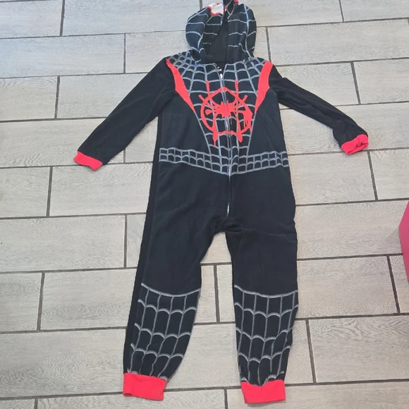 Cozy and fun, this Marvel Spider-Man "Into the Spider-Verse" fleece onesie features the Miles Morales black and red spider suit design with web detailing. Made from soft, flame-resistant fleece with a front zip closure and hood for extra warmth. Perfect for lounging, costume parties, or bedtime.