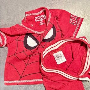 Marvel superhero costume set with spider design. Features red and cream colors. Perfect for imaginative play.