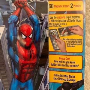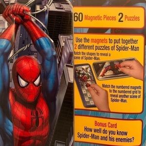 * Includes: 1 sheet of magnets (total of 60 individual magnets), 2 Puzzles, Bonus Card and a collectible mini tin. The embossed magnetic tin contains a full-color puzzle scene printed on the inside. Use the magnets to put together two different puzzles of Spiderman. Match the numbered magnets to the numbered grid.