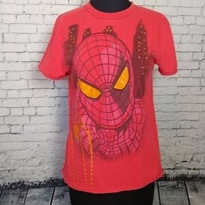Marvel Spiderman SZ Juniors XL Red T Shirt Face City Background Spiderweb Comic
