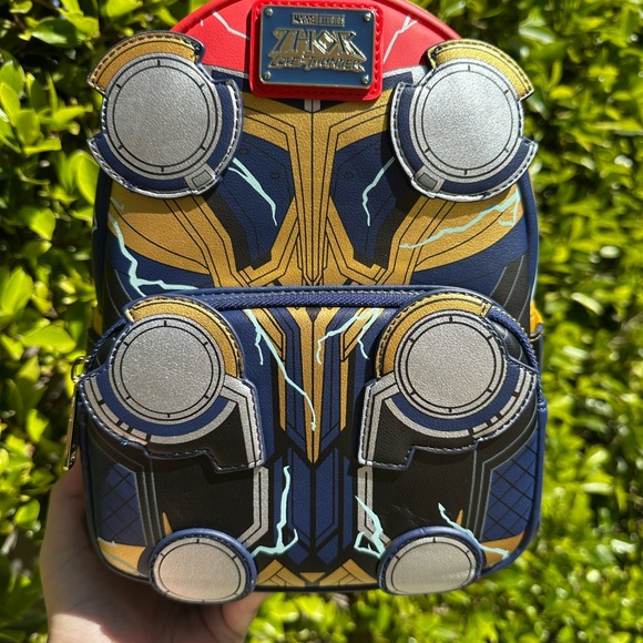 Marvel Thor mini backpack with a striking design. Features red, blue, gold, and silver colors.
