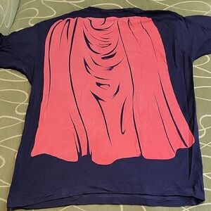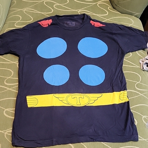 Official Marvel's Thor short sleeve tee. Navy base with four large blue chest circles. Bright yellow printed belt graphic across the waist. Small red shoulder accents. Red cape on back. Comfortable cotton blend for casual wear.