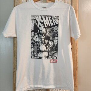 Classic Marvel style! White X-Men graphic tee featuring Wolverine, Cyclops, and more heroes in a bold black & white comic book cover design. Back has Wolverine claw marks graphic.