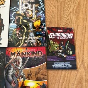 Collection of Marvel and DC comic books. Includes titles like Hawkeye, Cyclops, and Guardians of the Galaxy. Vibrant cover art with a mix of colors.