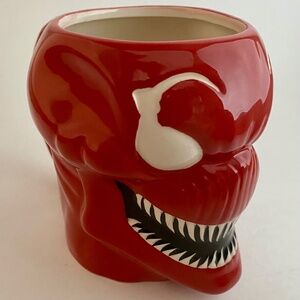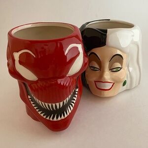 Two decorative mugs from Marvel and Disney representing cartoon characters, Carnage and Cruella De Vil. These ceramic mugs are approximately 16 oz. and useful for any beverage. Cruella is 5" tall, with 5" base. Carnage is 5.25" tall, with 3" base.