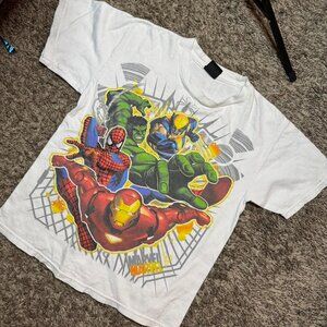 Vintage Y2K Marvel Spiderman Hulk Iron man Wolverine glittery print huge graphic mad engine shirt size tag is cut best fits youth large / xl youth kids baby toddler
