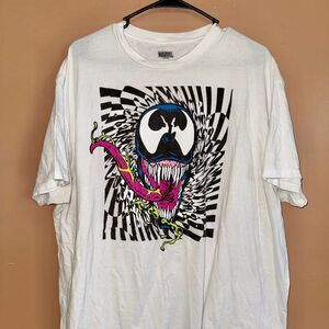 Awesome Marvel Venom Graphic Tee! This white t-shirt features a black hypnotic Venom logo, perfect for any Marvel fan.