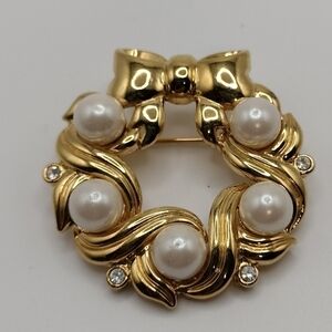 Marvella Brooch Gold Toned Metal Wreath w/ Bow Crystals and Faux Pearls Pin