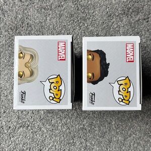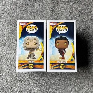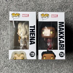 Funko Pop! figures of Thena and Makkari from Marvel’s Eternals. Both have been removed from box & boxes have slight wear.