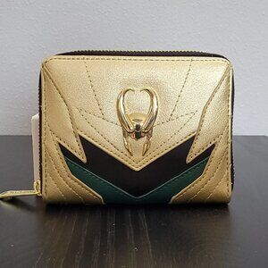 Highly detailed Marvel's Loki Loungefly zip-around wallet with the iconic emerald and gold motif all over.