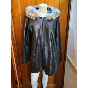 Marvin Richards Black Genuine Leather Coat L Faux Fur Trim Hood