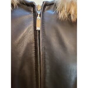 Classic Marvin Richards women’s genuine leather coat in rich black with a plush faux-fur trim hood.