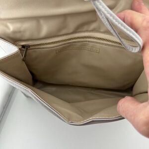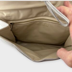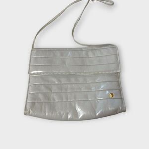 Classic gray crossbody bag by Mary Ann Rosenfeld with gold-tone accent. Gray is more of a light/silver gray. Bag measures 10 1/2" x 8" x 2". Straps are 38 1/2" with an 18" drop shoulder to top of bag. Interior has a gold-tone metal zippered pocket. Pre-owned, gently used. No visible signs of wear, except the snaps closing the interior have minor scuffs. See pictures.