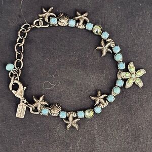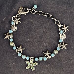 Stylish bracelet featuring “Under the Sea”charms and blue accents. This is a Mary Demarco bracelet that is sea-inspired. These bracelets typically go for far more than I’m asking here. It features a beautiful starfish and is decorated with opal-like accents as well as some aurora borealis tid-bits. Please review all the photos as they are part of the description.