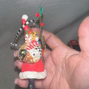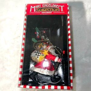 This ornament from the Mary Engelbreit collection features a whimsical Santa Claus theme. Made from resin, it showcases intricate details and vibrant colors in a red star pattern. It is a licensed reproduction, handmade, and comes in its original box. This pre-owned item is in good condition.