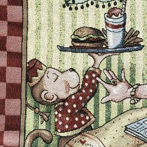 Vintage 1997 Mary Engelbreit large woven tapestry throw blanket, featuring her whimsical "Princess of Quite-a-Lot" design. The scene shows a princess lounging in a lavish setting, complete with a butler monkey and two playful kittens. It has her signature checkerboard border, and rich colors in shades of red, blue, green, and yellow. Finished with fringe on all sides. Perfect for adding a cozy touch to your sofa, reading chair, or bedroom.