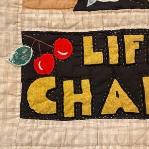 Mary Engelbreit Vintage Detailed Stitched "Chair of Bowlies" Baby Child Quilt. Vintage stitched quilt by Mary Engelbreit. "Life is Just a Chair of Bowlies" quote stitched across the bottom of the illustration. Cherry pattern along the edges. 61"x46.5" as pictured. In great vintage condition, see photos for more details.