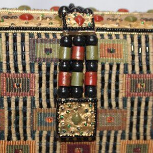Pre-owned Mary Frances bag. Hand made and heavily beaded. Gold, Khaki, Terracotta, Olive and Black. Handbags strap is completely made of beads.