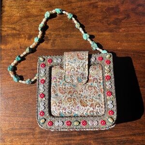 Mary Frances Beaded Brocade Purse with Turquoise and Pearl Strap