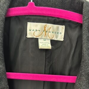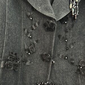 Chic black blazer with intricate beadwork. Features lace trim and floral accents. Perfect for elegant occasions. Denim like material. Photographs make it look faded but in person it’s very dark.