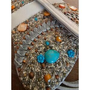 This stunning Mary Frances wristlet features striking turquoise stones and beautiful beaded accents. Chic Southwestern vibes make it a standout for any boho lover's collection.