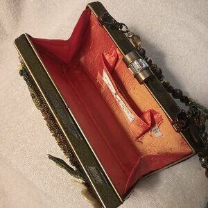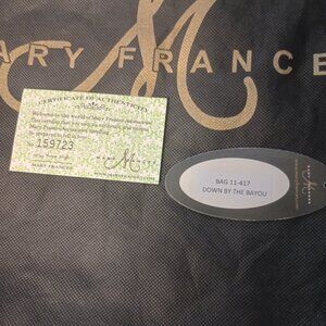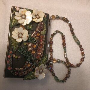 This is an older retired bag from a private collector. Good vintage condition with some discoloration on the white flowers. Very rare. A beaded Alligator, white floral applique, embellished leaves. Super cool bag for Cajun Lovers, NOLA and Mardi Gras. Approximately 7"Wx4"Hx2"D. Removable beaded strap, 15" drop. Some inside slip pocket. Original tag, extra beads and card of authenticity and dust bag included. Never used! Private collector, smoke free home.
