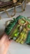 Elegant bag with intricate green beadwork. Features gold and green beaded chain and accents. Perfect for evening events.