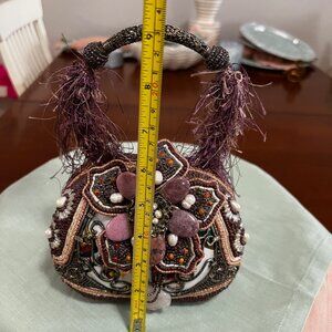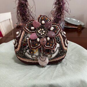 Retired, vintage Mary Frances handbag, petite and dainty is adorned with lots of beads and embellishments. No defects that I can detect. Comes with original purchase tag and Mary Frances Dust Bag. $115.00. Please see pictures for measurements. Purple, dusty rose, with green and yellow cloth print on the back. Very pretty! Smoke and pet free home. Thanks for looking and please check my other listing for more beautiful, retired vintage Mary Frances bags!
