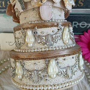 * A very ornate and heavily decorated tiered wedding cake bag layered with faux pearls, rhinestones, metallic embellishments, applique beaded flowers, glistening sequins, and hundreds of hand laid beads...a true beauty for a princess bride!