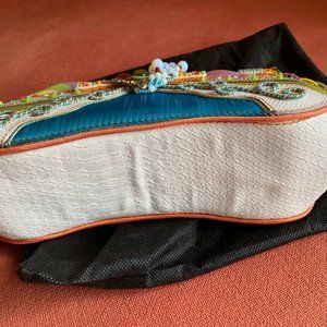 This classic Mary Frances Bag has a Peter Max 1960s vibe. It is like new with NO wear or tear. Really gorgeous but I never use it. I think it needs to go to someone who will love it and carry it around. LET IT LIVE! Here it just sits in the original dust bag. The front is super fancy with fabric, beads, "jewels," and textured leather. The back is a fabulous Peter Max inspired print fabric.