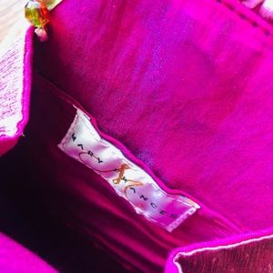 Black velvety sueded fabric front and back but the gussets on the side are a peach silky fabric and everything is bound in a spring green. It’s adorned front and back with appliqués of beige and coral flowers in a sude-like fabric and embellished with beads and small stones. The appliqués are sewn on with metallic gold thread adding a delicate sparkle. In addition, there are butterflies made of embroidered organza.8 inches wide at the bottom, 4 inches wide at the top, and 9 inches tall