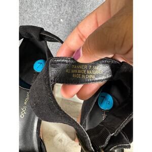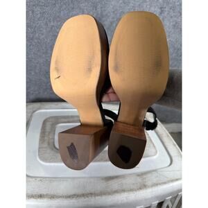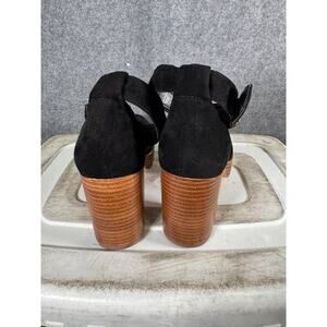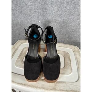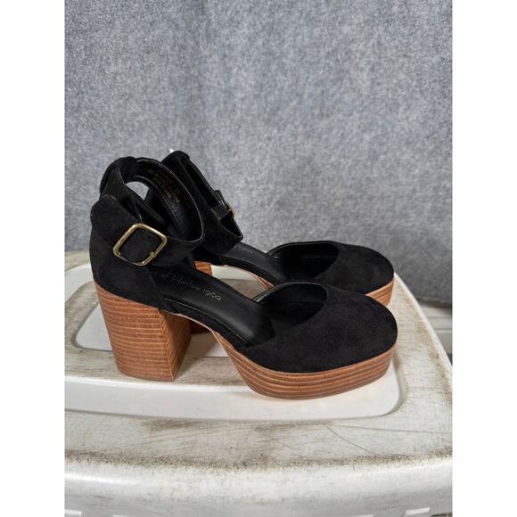 Stylish Mary Jane heels. Black suede upper. Chunky brown wooden heel. Adjustable strap with buckle.