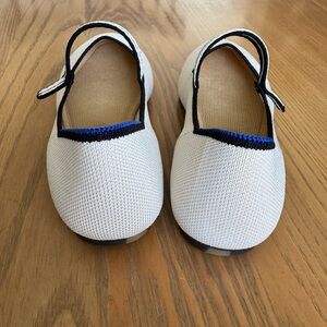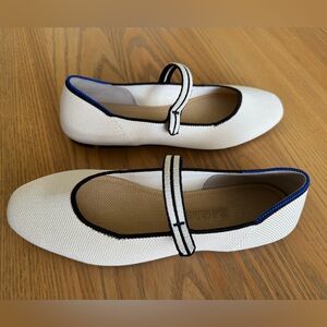 Ecru with black stripe strap Mary Jane Rothy’s. These are in excellent condition. Wore only a couple of times and decided I needed a different size.