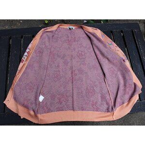 This is a long line, button front cardigan in a typical MaryKat floral pattern with faint metallic accents.