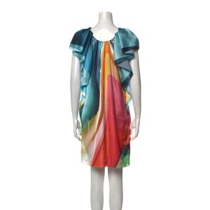 Catch all eyes with this stunning Mary Katrantzou designer dress in abstract watercolor rainbow of colors, with flutter ruffle sleeves and deep scooped neckline. Kaftan shift dress style. Excellent condition.
