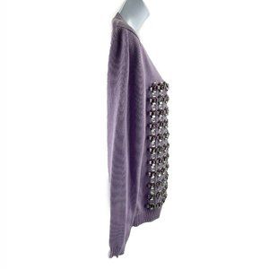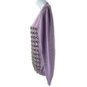 This lilac colored sweater is crafted of 100% cotton, and features a ribbed crewneck and cuffs, stylized crystal embellished flowers woven in a pattern with silver leather and shiny rhinestone in the middle.