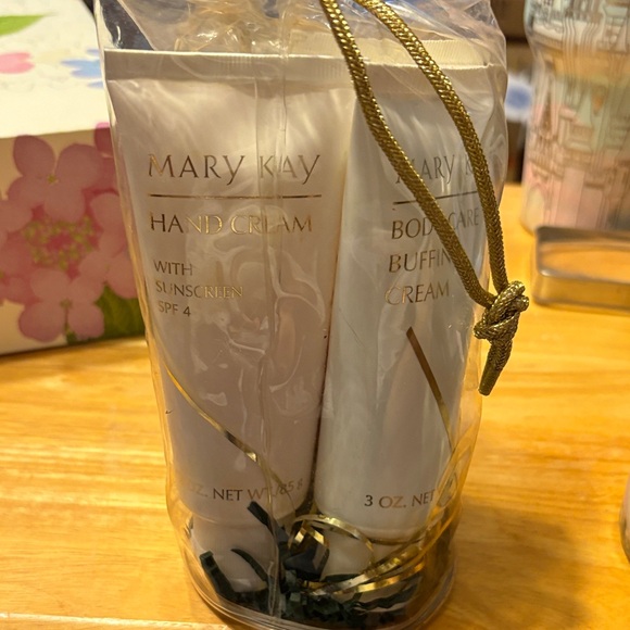 Includes hand cream with SPF 4 and body buffing cream. Elegant gold accents.
