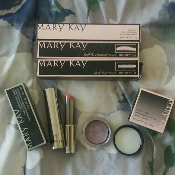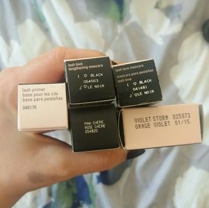 Includes 2 Mascaras and a primer that are brand new, a lipstick swatched once, and a cream eyeshadow swatched once.
