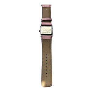 This beautiful women's watch features a silver tone 28 mm wide case and a pink analog dial with square indexes and Arabic numerals. The two-piece leather strap has a buckle closure and fits a wrist size of 6.1-6.25 inches. The watch is powered by a quartz movement and is not water resistant. This watch needs a new battery.