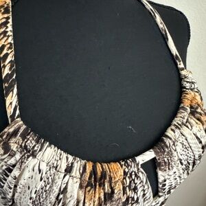 Embrace your wild side with this chic animal print halter dress. Perfect for any occasion, this dress features a stunning blend of black, brown, and cream colors. The halter neckline adds a touch of elegance, making it a versatile addition to your wardrobe.