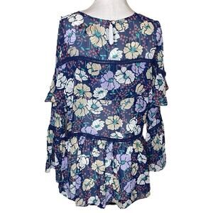 Flowy Sheer Ruffles Whimsical Feminine Cottage Mary & Mabel Floral Tunic Blouse Womens S Oversized Boho Chic