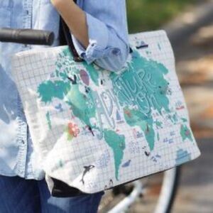 New! Plastic bag was ripped from me opening it but tote has never left the bag otherwise. Print on both sides of the tote. 21 x 13. Large tote with open snap top and pockets inside.