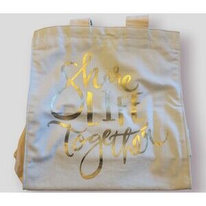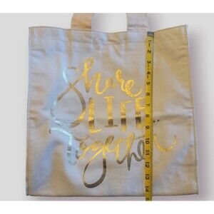 This Mary & Martha Living tote bag is personalized with the words "Share Life Together" written in gold. There is a pocket on the inside of the bag.