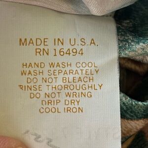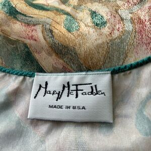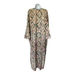 Vintage Mary McFadden caftan in green and gold mosaic print. V neck and wide sleeves. On seam pockets. Side slit. 100% poly. Silky satin fabric. Hand wash recommended. Bust 28” length 55”. Excellent condition. One Size. Would comfortably fit up to XL