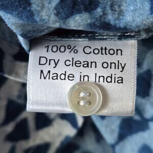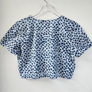 Brooklyn-based designer, Mary Meyer short sleeve cropped top with round neckline and batik block print geometric triangle graphic. Lightweight and breathable cotton shirt. Handloom textile in blue & white color colorway. Made in India. Sold out style, no longer sold in stores.