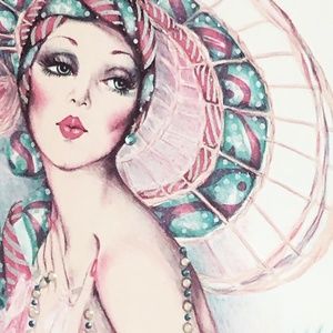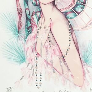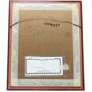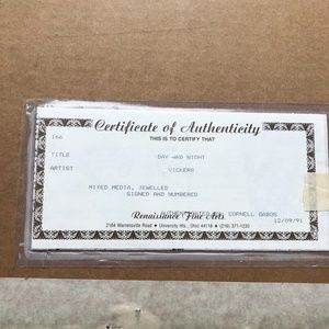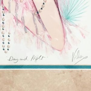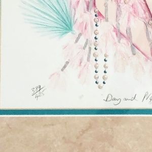 Authentic, preowned 'Day & Night' Jeweled Embellished Lithograph Print by artist Mary Vickers, numbered with COA and signature, from 1991. Comes in frame with matte as shown and with COA. Preowned in very good condition, with some wear noted to frame and backing. Personalized with signature in back (pics 9 & 10); numbers in marker written on back (pic 9). Measures 19.5in H x 17in L in frame; matte/print measure 16.5in H x 14in L.
