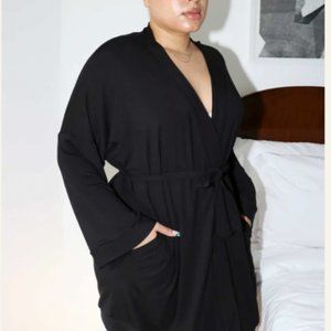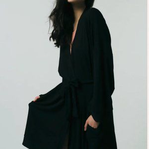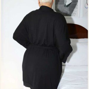 "Oli" Robe from Mary Young. Hits mid-thigh with raglan loose sleeves, side pockets, and a waistband. Nice lightweight robe for lounge, sleepwear, or wearing as a cardigan.